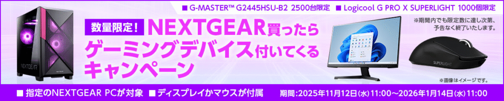 コスパ重視のブランド「NEXTGEAR」が対象となるキャンペーンは珍しく、開催されていれば見逃せないお得なチャンスといえます。