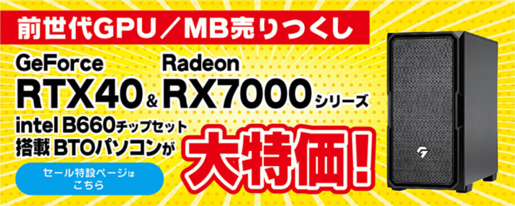 TSUKUMOのBTO売り尽くしセールでは、前世代のGPUやマザーボードを搭載したモデルを、在庫処分価格でお得に購入できます。