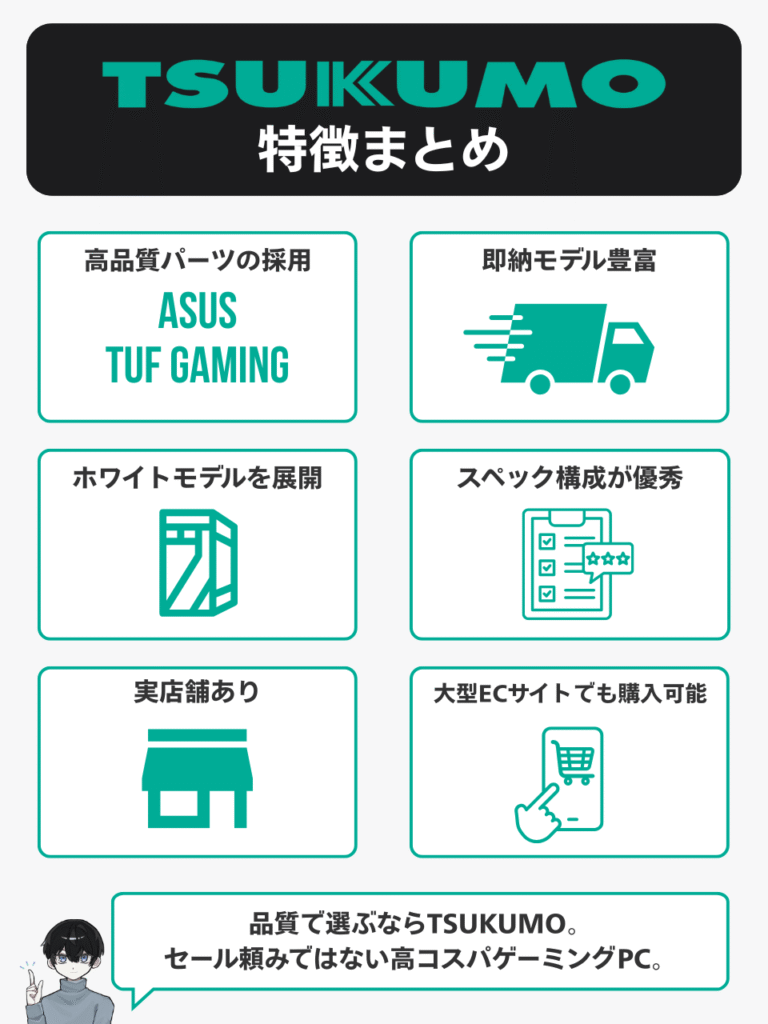 TSUKUMOのゲーミングPCは、品質と安定性を軸に選びたい方にぴったりのメーカーです。