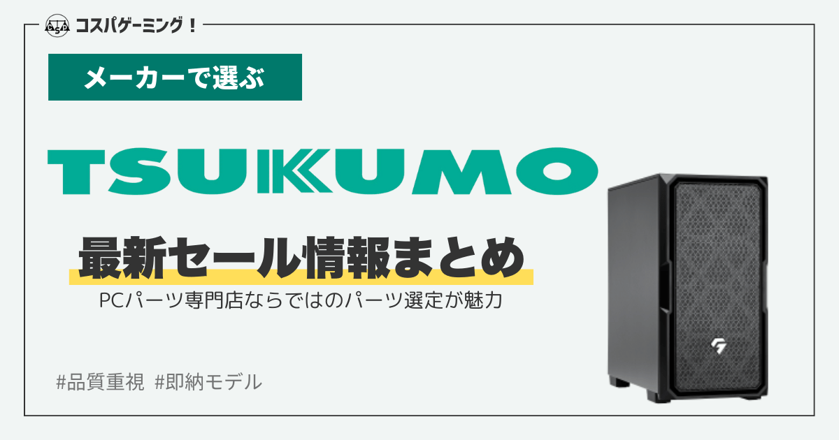 TSUKUMOのゲーミングPCは、PCパーツ専門店ならではの高品質構成が魅力的。セールやキャンペーンのラインナップ数は少なめではあるものの通常価格がコスパ抜群のため、いつでもお得に購入可能です。